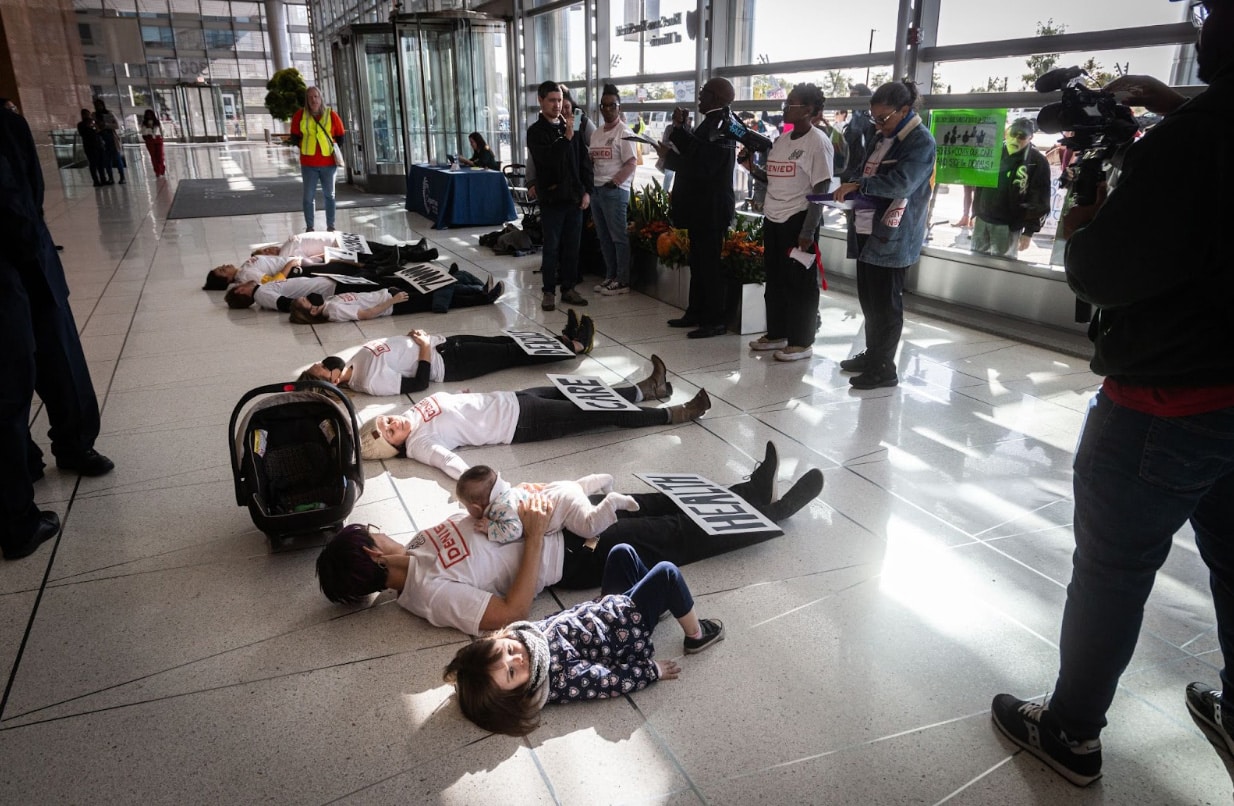 Seven protestors lay in the lobby Wednesday morning to represent the 700,000 Americans whose medical claims are denied by their private insurers each day