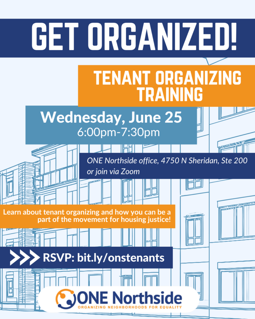 So far, this year, ONE Northside has helped establish 2 tenant unions — one in Rogers Park and one in Uptown — who were both facing lease terminations due to new corporate landlords who wanted to update the buildings and raise rents. These tenant unions fought and won relocation assistance and other benefits from their new landlords, however they are both examples of why we need a law like Just Cause for Eviction in place.
