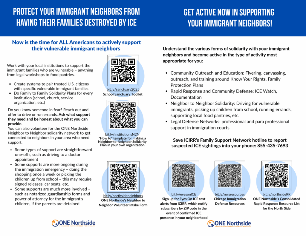 ONE Northside and our partners and allies are working to coordinate resources to protect the most vulnerable of our neighbors – immigrants, poor and unhoused people, Black people, and youth – from federal agents/troops. The following resources are Emergency Family Plans and Know Your Rights cards that are especially valuable for immigrant families who may be vulnerable to increased surveillance and targeting by ICE/DHS/other federal authorities.